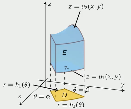If E={(x,y,z)∣(x,y)∈D,u1(x,y)≤z≤u2(x,y)} and D is given in polar coordinates by α≤θ≤β, h1(θ)≤r≤h2(θ),